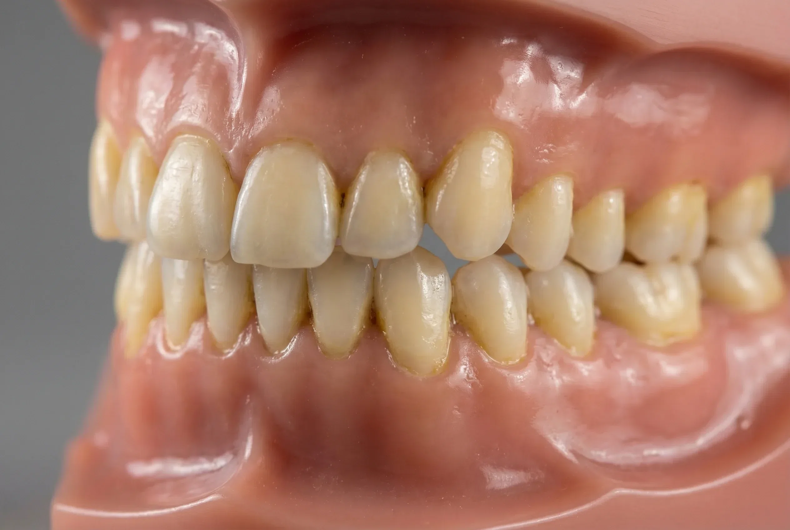 - Ungleichmäßige Abnutzung: Ein schiefer Kiefer oder falsch positionierte Zähne führen dazu, dass einzelne Zähne stärker belastet werden als andere. Dies kann langfristig zu vorzeitigem Zahnverschleiß führen.